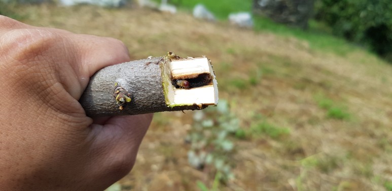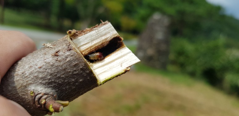 유충에 의한 피해 입은 가지의 상태
